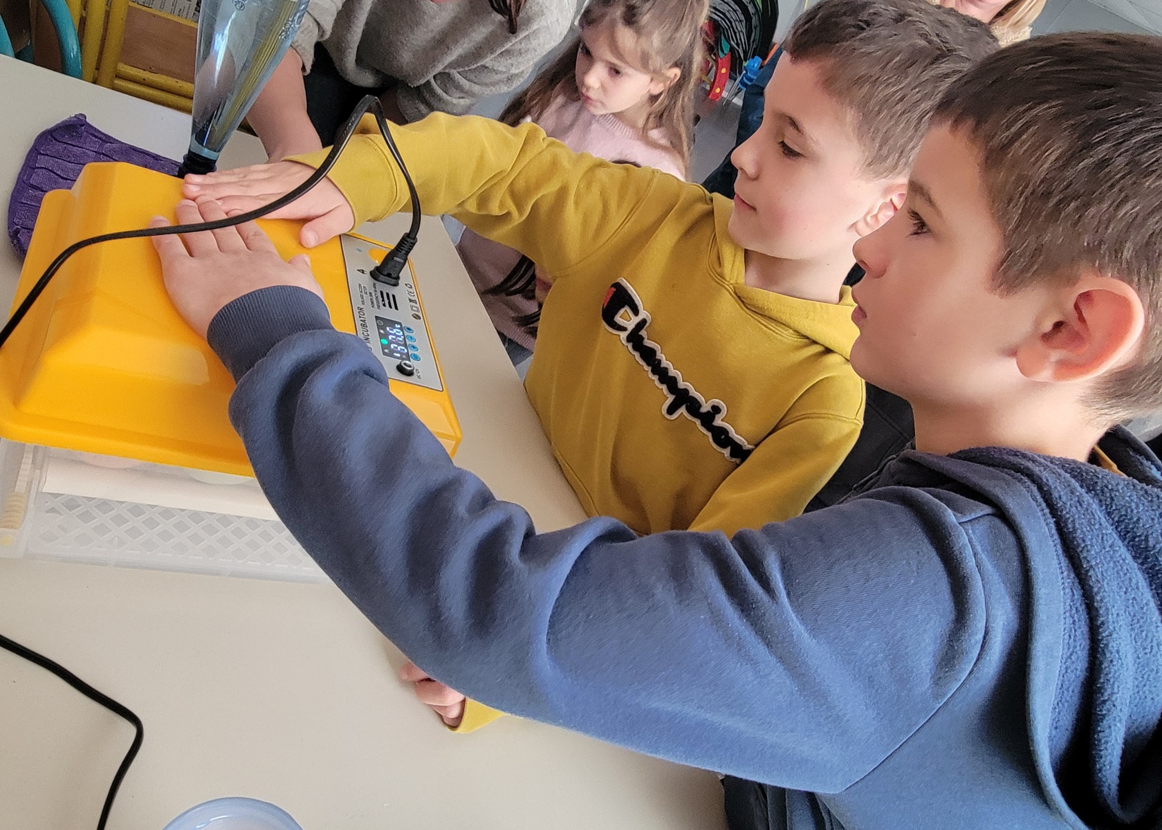 Suite à la mise en place de la couveuse, et après 21 jours d’attente, 2 premiers poussins sont nés. Nous avons eu la surprise de les découvrir en arrivant à l’école le jeudi 26 mars. Un 3ème oeuf a éclos, avec un peu de difficulté, le samedi 28 mars après la classe. Nous avons pu le voir pour la 1ère fois le lundi 30 mars.